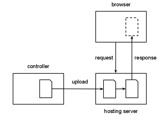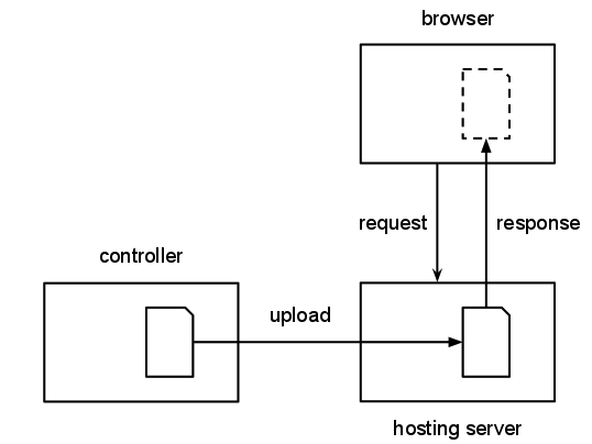 A controller uploads a file to a hosting server, which is then accessed by a browser.