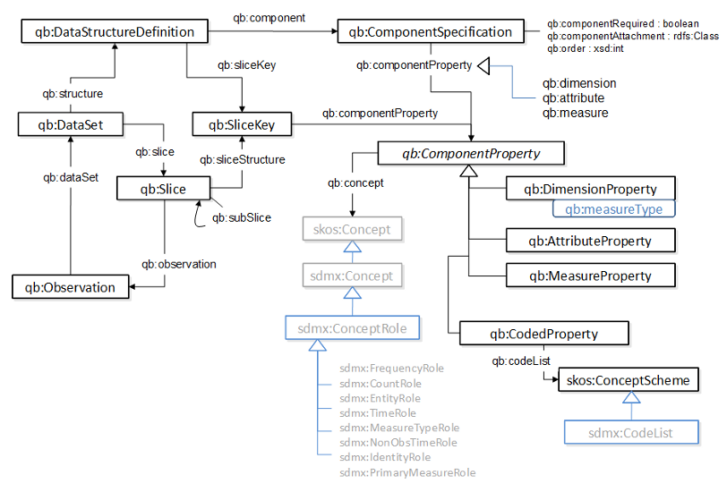Properties: qb:attribute qb:codeList qb:component qb:componentAttachment qb:componentProperty qb:componentRequired qb:concept qb:dataSet qb:dimension qb:measure qb:measureDimension qb:measureType qb:observation qb:order qb:slice qb:sliceKey qb:sliceStructure qb:structure qb:subSlice