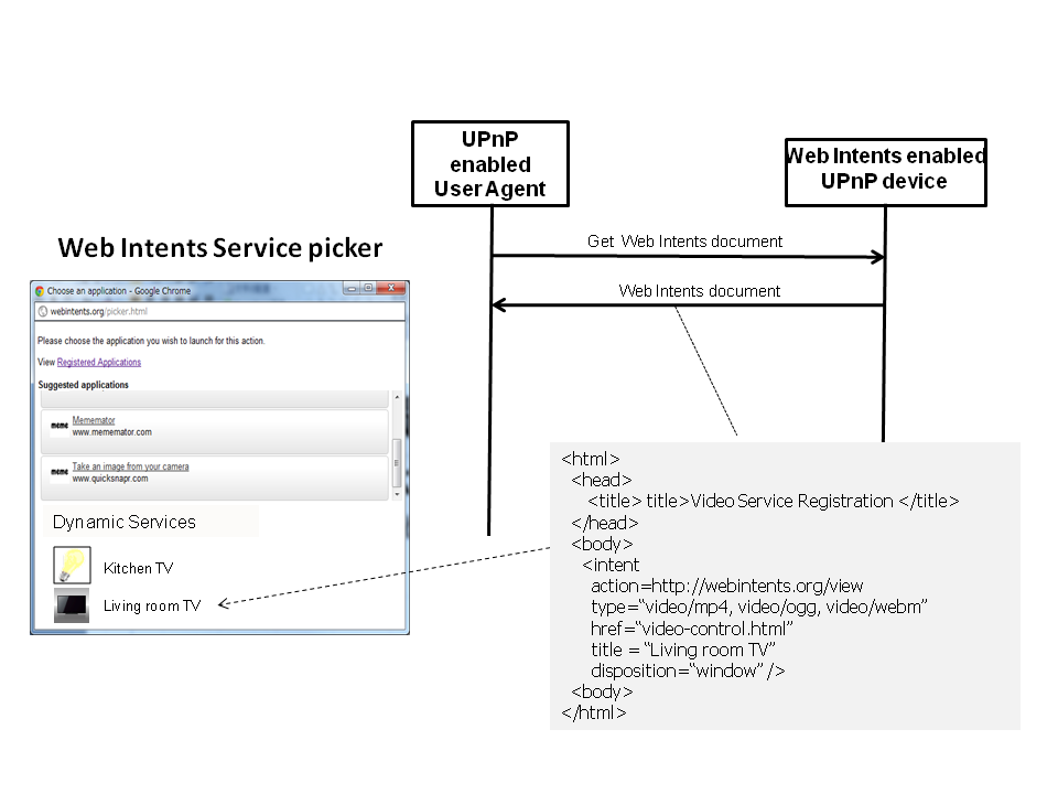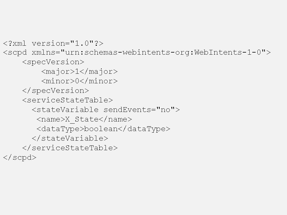 See below for the UPnP Service description document of the Web Intents serviceType.