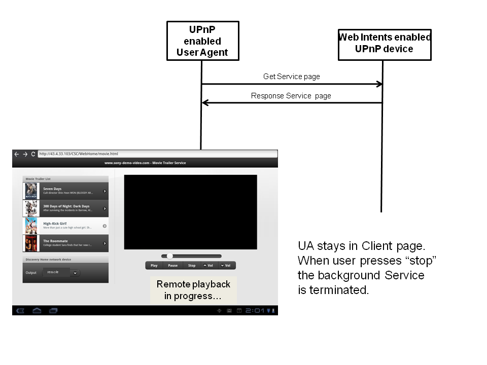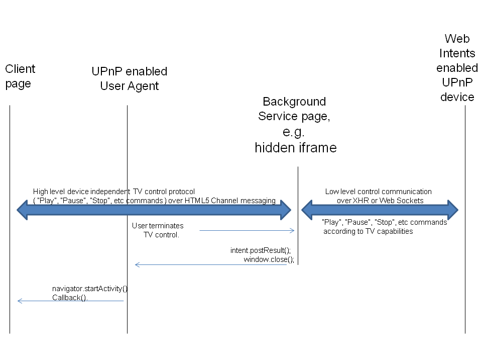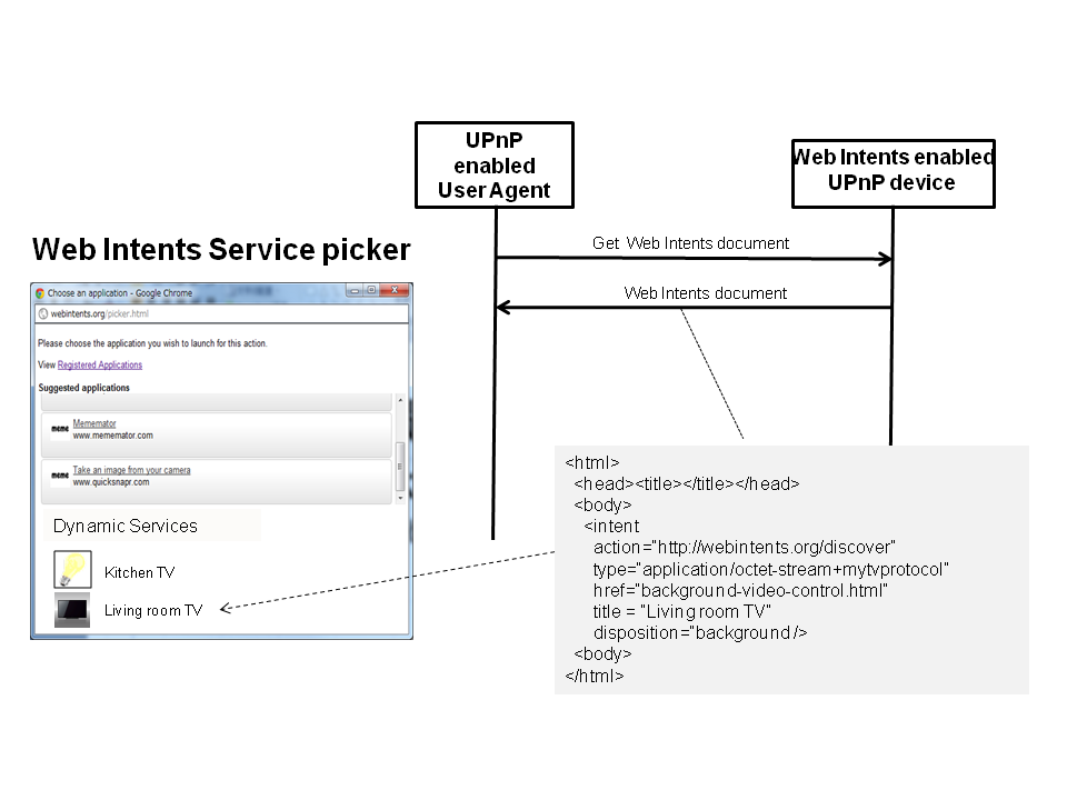 In addition to the normative statements defined in this specification a UPnP enabled User Agent that complies to this specification supports Web Intents according to [WEBINTENTS] and UPnP Discovery, Description and Control according to [UPNP-DEVICEARCH]. However, it is implementation dependent whether this is supported natively in the User Agent or supported through some external component, e.g. an in-device web server.