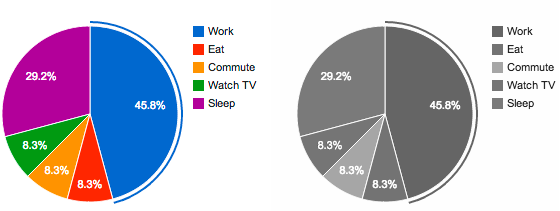 However, displaying a color image on monochrome media (e.g., paper and e-ink displays) can be problematic: different colors with similar luminosity are impossible to distinguish on monochrome media. This problem is illustrated in the figure below, where it becomes nearly impossible to associate slices of a pie chart with corresponding labels.