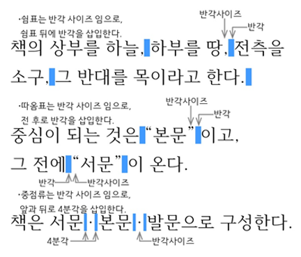 한글 환경에서 문자와 기호는 타이포그래픽 특성에 따라 괄호, 하이픈, 문장구분 기호 등 32가지로 구분한다.