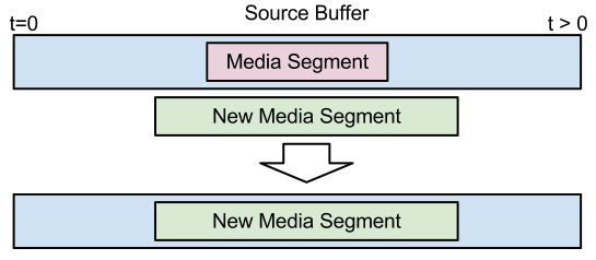 The figure above shows how the SourceBuffer is updated when a new media segment completely overlaps a segment in the buffer. In this case, the new segment completely replaces the old segment.