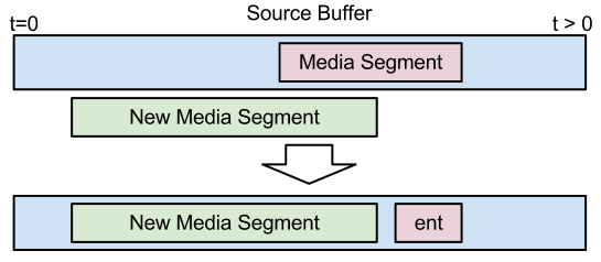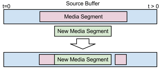 The figure above shows how the SourceBuffer is updated when the new media segment is in the middle of the old segment. This condition is handled by first resolving the start overlap and then resolving the end overlap.