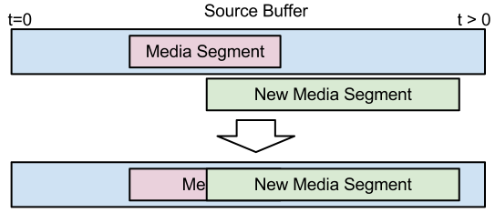 The figure above shows how the SourceBuffer is updated when the beginning of a new media segment overlaps a segment in the buffer. In this case, the new segment replaces all the old media data in the overlapping region. Since media segments are constrained to starting with random access points, this provides a seamless transition between segments.