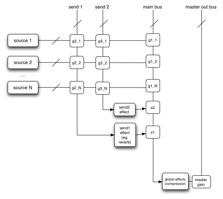 Here's a more complex example with three sources and a convolution reverb send with a dynamics compressor at the final output stage: