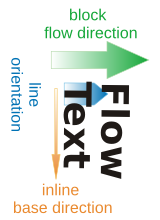 A horizontal writing mode is one with horizontal lines of text, i.e. a downward or upward block flow. A vertical writing mode is one with vertical lines of text, i.e. a leftward or rightward block flow.