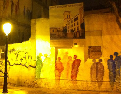 <figcaption>]Shadow like figures and a graffiti tag drawn on the walls of a