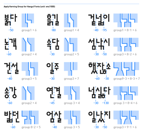 Group kerning can be applied for efficient adjustment of kerning for the 11,172 Hangul syllables. In order to apply Hangul group kerning, kerning groups are defined first, then groups are paired.