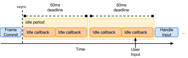 Another example of an idle period is when the user agent is idle with no screen updates occurring. In such a situation the user agent may have no upcoming tasks with which it can bound the end of the idle period. In order to avoid causing user-perceptible delays in unpredictable tasks, such as processing of user input, the length of these idle periods should be capped to a maximum value of 50ms. Once an idle period is finished the user agent can schedule another idle period if it remains idle, as shown in Fig. 2 Example of an idle period when there are no pending frame updates, to enable background work to continue to occur over longer idle time periods.