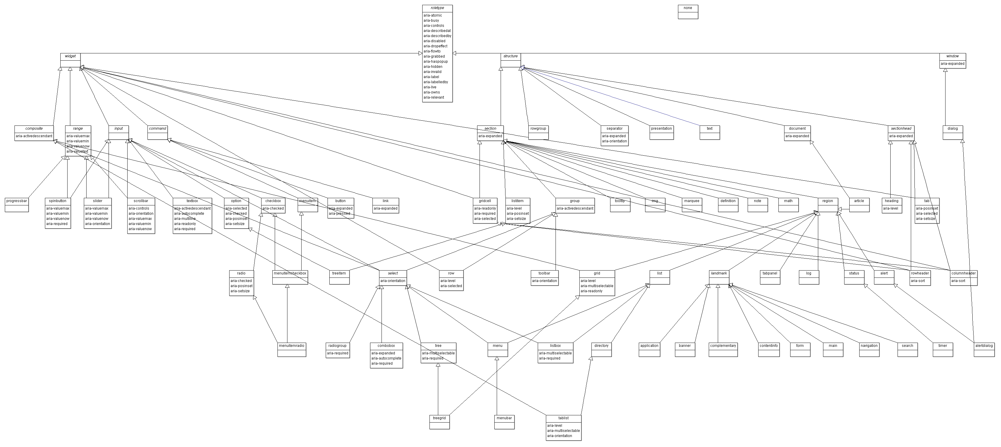 This role taxonomy includes interaction widgets and elements denoting document structure. The role taxonomy describes inheritance and details the attributes each role supports. Information about mapping of roles to accessibility APIs is provided by the WAI-ARIA User Agent Implementation Guide [WAI-ARIA-IMPLEMENTATION].