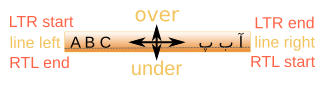 The Unicode standard (Unicode Standard Annex #9) defines a complex algorithm for determining the proper ordering of bidirectional text. The algorithm consists of an implicit part based on character properties, as well as explicit controls for embeddings and overrides. CSS relies on this algorithm to achieve proper bidirectional rendering.