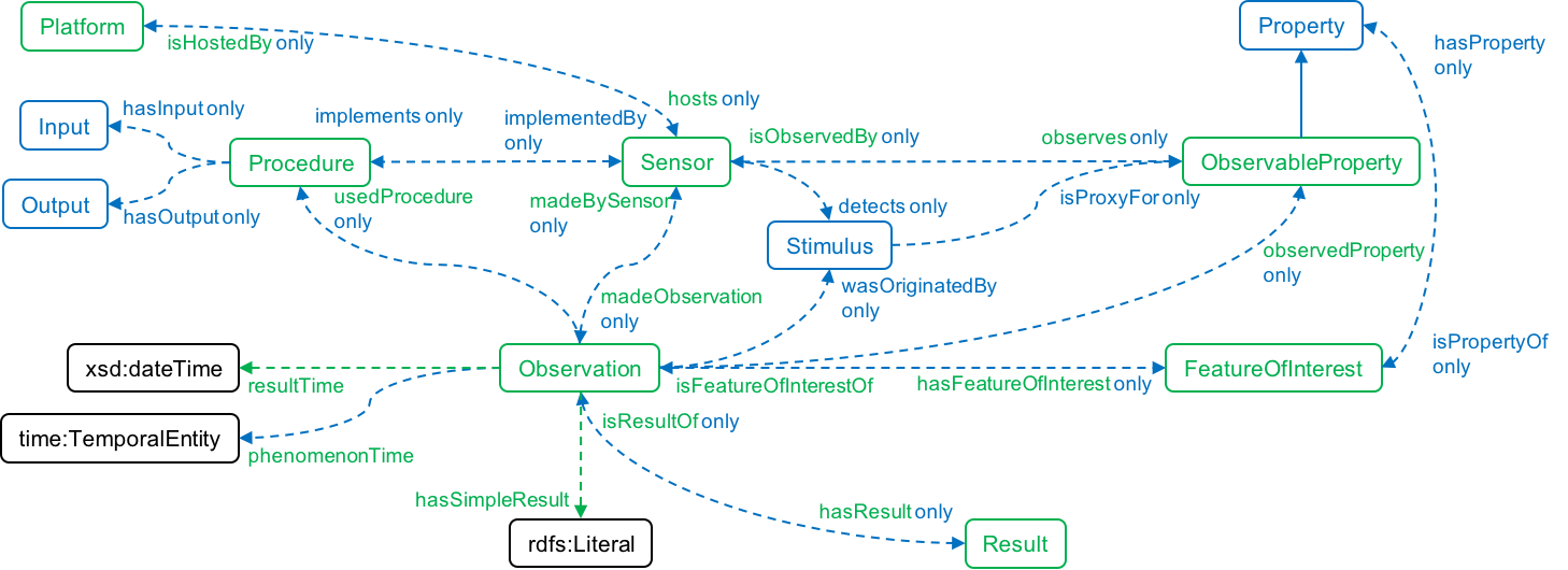 sosa:ObservableProperty, sosa:Observation, sosa:observedProperty, sosa:phenomenonTime, sosa:Sensor, sosa:observes, sosa:isObservedBy, sosa:madeObservation, sosa:madeBySensor, ssn:Stimulus, ssn:isProxyFor, ssn:wasOriginatedBy, ssn:detects