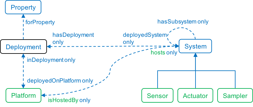 An overview of the main classes and properties inside the ontology modules can be seen in the following figures, from the perspectives of Observation, Actuation and Sampling. In the figures, and in the rest of the document, SOSA-related components and restrictions are shown in green, while SSN-only components are shown in blue.