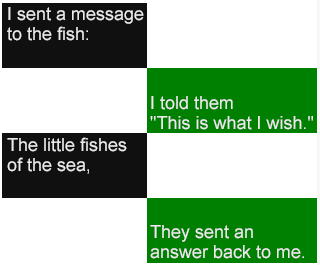An example of paint-on captions. In this example, two regions are targeted with alternating, paint-on content, where content is timed using explicit sequential time containment rules. Each paragraph is non-overlapping in time and appears in the same single row of its targeted region.
