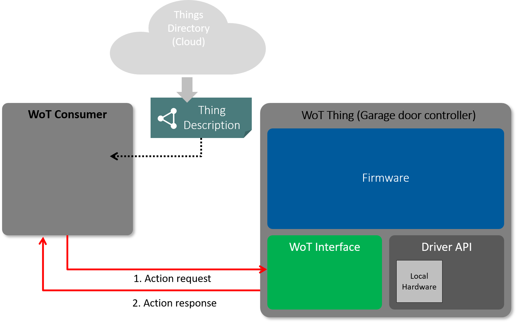 From a security point of view two aspects are important to consider in this scenario. First, the WoT Consumer should be certain that it is talking to the correct WoT Thing and not to some other device exposed on the same network. Users intending to control a specific device, for example opening a garage door, want to make sure they are talking to their own garage door device. In security terms this means that WoT Consumer must have a way to authenticate the device exposing the WoT Thing. Second, upon receiving requests from a WoT Consumer, the WoT Thing must verify the the WoT Consumer is authorized to perform such requests. For example, a garage door must only process "open" requests from devices associated with authorized users or service providers and not from arbitrary passerby.