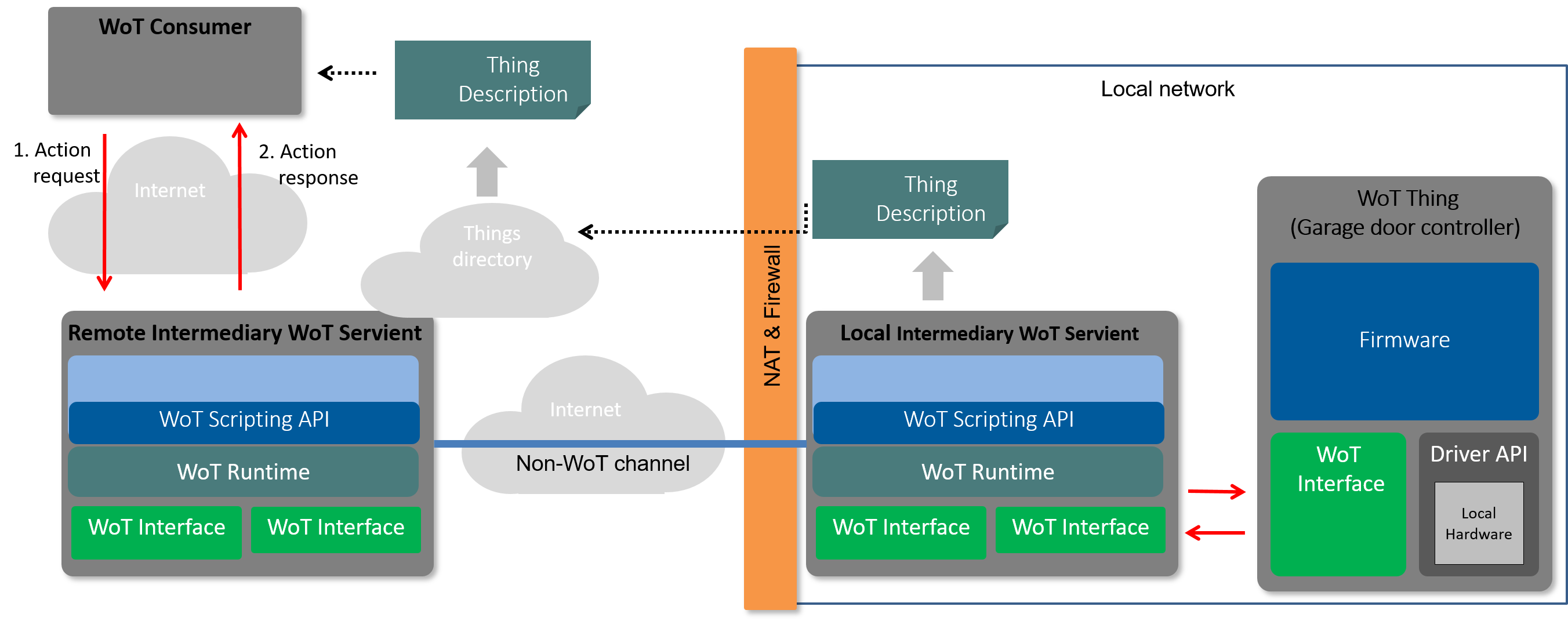 The Thing Description that the Intermediary WoT Servient device provides to the WoT Consumer can be the same as it gets from the device exposing the WoT Thing or it can be modified to better suit the deployment use case or expose additional functionality via the Intermediary WoT Servient. It is also possible that the end device behind the Intermediary WoT Servient is a non-WoT Device and does not provide any Thing Description on its own, and may not support any interaction via a WoT-compatible network Interface. In this case the Intermediary WoT Servient has to build the Thing Description by itself i and expose it to the WoT Consumer. For all typical use cases, the Intermediary WoT Servient should be considered a trusted entity and in this case it can freely modify or build Thing Descriptions it exposes as well as set up fine-grained access controls on different exposed WoT Interfaces. The Intermediary WoT Servient can do this using the same methods described in Section § 7.1 Basic Interaction between WoT Thing and WoT Consumer, i and therefore acts fully on behalf of the end device.