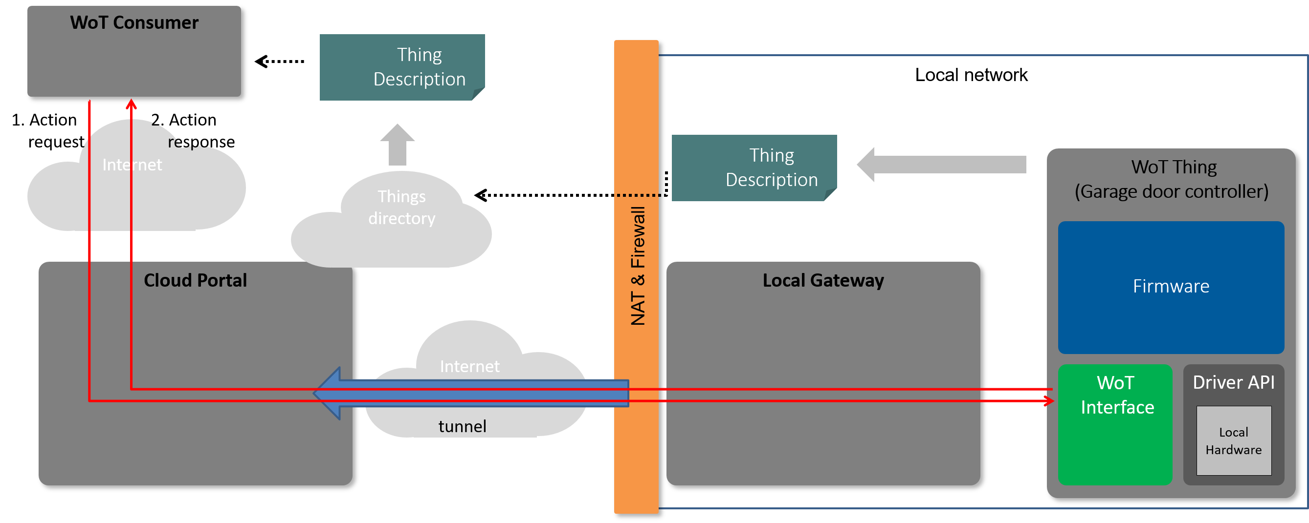 In this configuration the WoT Thing must be responsible for all security, including (if necessary) certificates appropriate for the tunnel endpoint in the cloud. i This implies that the WoT Thing needs to be relatively powerful, as constrained devices may not be able to support security mechanisms suitable for direct exposure on the Internet. The WoT Thing would also have to be actively maintained and patched. If the WoT Thing provides a TD, it should use URLs that refer to the tunnel endpoint. This generally means that the port used for the local side of the tunnel should not be used to provide local connections as the certificates will be incorrect for local connections. Instead a separate port (and possibly a separate TD with local URLs) should be provided.