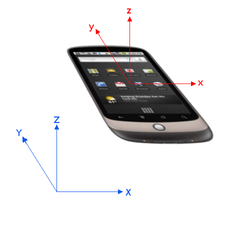 For a mobile device such as a phone or tablet, the device coordinate frame is defined relative to the screen in its standard orientation, typically portrait. This means that slide-out elements such as keyboards are not deployed, and swiveling elements such as displays are folded to their default position. If the orientation of the screen changes when the device is rotated or a slide-out keyboard is deployed, this does not affect the orientation of the coordinate frame relative to the device. Users wishing to detect these changes in screen orientation may be able to do so with the existing orientationchange event. For a laptop computer, the device coordinate frame is defined relative to the integrated keyboard.