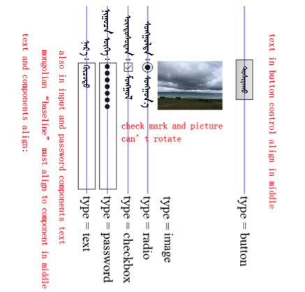 All input controls need to be adjusted to match the characteristics of the vertically typeset Mongolian text. For example, controls like text fields and buttons need to support vertical input and display of text, and furthermore the cursors in text and passwords need to conform to the cursor style as shown in Figure 8.