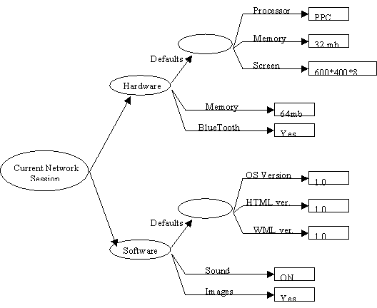 The introduction of "Defaults" makes the graph of each major component more of a simple tree than a table. In this example the major components are associated with the current network session. In this case, the network session is serving as the root of a tree that includes the trees of each major component. RDF was originally intended to describe metadata associated with documents or other objects that can be named via a URI. The closest thing to a "document" associated with a CC/PP is the current network session.