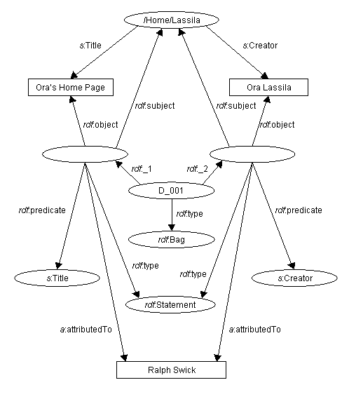 <rdf:RDF> <rdf:Description about="http://www.w3.org/Home/Lassila" s:Creator="Ora Lassila" /> </rdf:RDF>