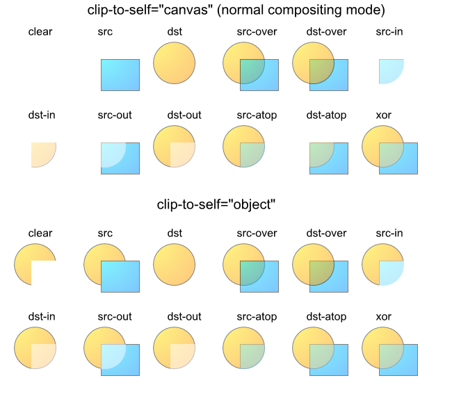 Most compositing operations do not remove the destination and as such for these operations, the ‘clip-to-self’ property has no effect. The compositing operations that remove the destination are clear, src, src-in, dst-in, src-out and dst-atop. These operations are illustrated in the compositing operation diagrams and are the operations that remove the right-hand blue region in diagram. For all other operations the ‘clip-to-self’ property has no effect.