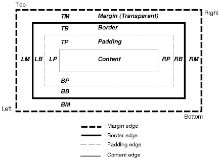 The padding, border, and padding can be broken down into left, right, top, and bottom segments (e.g., in the diagram, "LM" for left margin, "RM" for right margin, "TM" for top margin, "BM" for bottom margin, etc.).