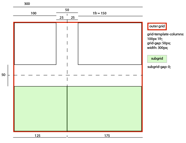Grid Level 2 adds the subgrid feature: a subgridded axis is one which matches up its grid lines to lines in the element’s parent’s grid, and which derives the sizes of its tracks through this integration with the parent grid.