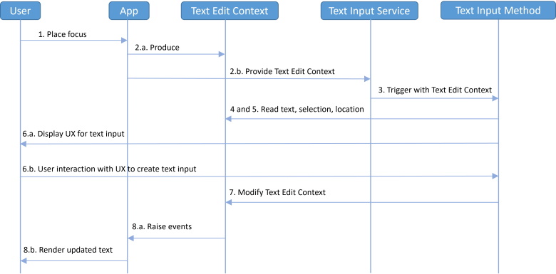 For the purposes of this document, a producer of text is known as a Text Input Method. The view provided by an app which wants to consume text is called a Text Edit Context. The service provided by the OS to facilitate the editing of text in the Text Edit Context by the Text Input Methods is called a Text Input Service.