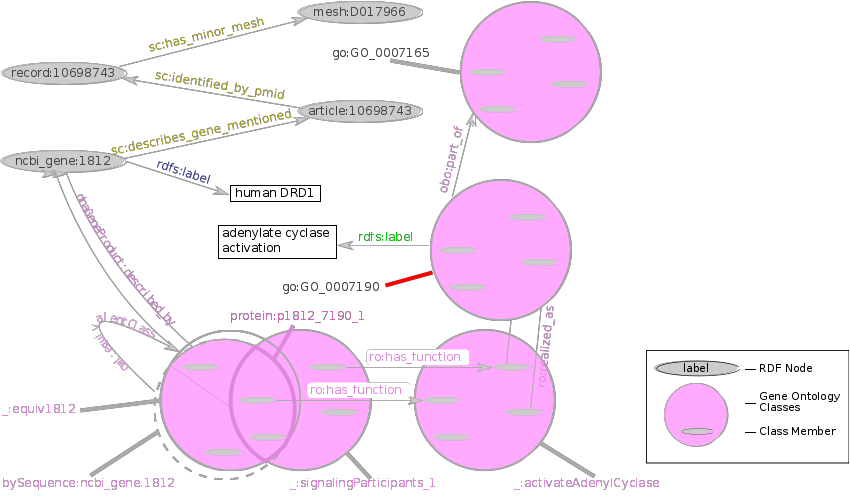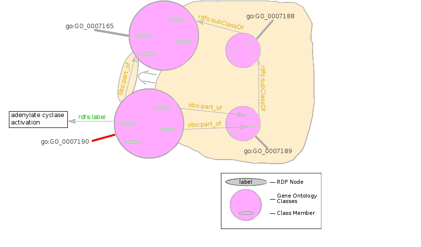 Using our other supplied constant, we note that adenylate cyclase activation, go:GO_0007190, is part of signal transduction, go:GO_0007165. Note: this simplified query matches only processes that are a sub-process of go:GO_0007165; the actual query, described in §9 Named Graphs, looks also for subclasses. The part_of relationships were inferred from the OWL class restrictions described in §7.1 Precomputing Inferences. The class of functions that are realized_as adenylate cyclase activation is here labeled _:activateAdenylCyclase.