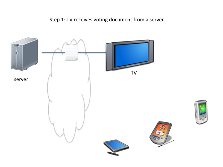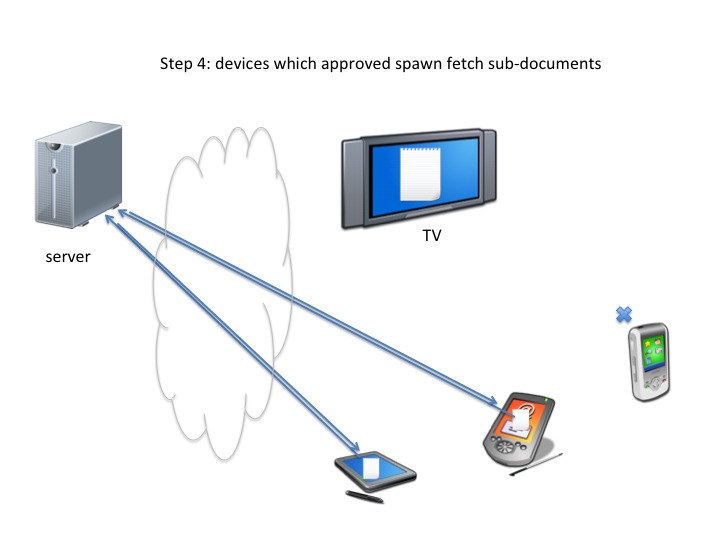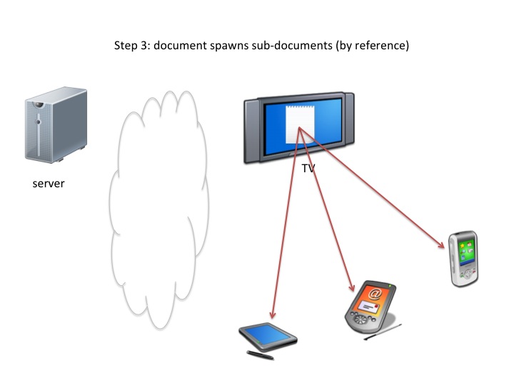 An application spawning other applications on other devices and communicating with them: e.g. the TV set receives and renders an application implementing some voting; the application discovers multiple phones in the home, proposes to activate voting interfaces on each of the viewers' phones, communicates with the voting interfaces, collates votes and sends them back to the channel's voting service.