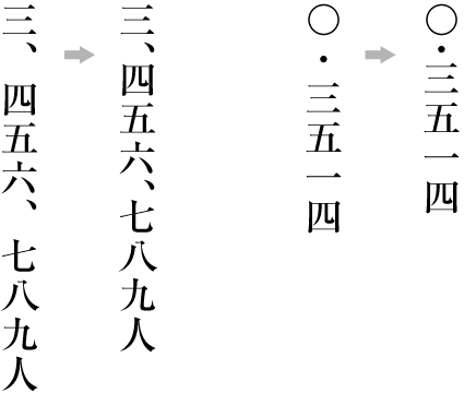 It should be possible to decrease the size around the ideographic comma (1/2em) and katakana middle dot (1/4em) in numerical values in vertical text. See Exceptional Positioning of Ideographic Comma and Katakana Middle Dot.