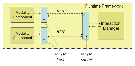 In this deployment scenario the Interaction Manager acts as an HTTP server, whereas modality components are HTTP clients, sending HTTP requests to the Interaction Manager. But other configurations are possible.