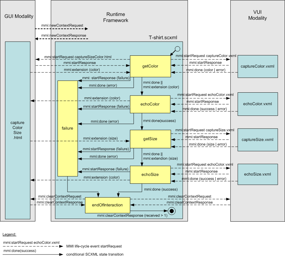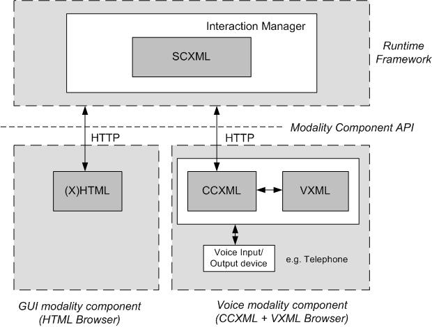 Even though HTTP might not be the most efficient solution as a transport protocol, it still has some advantages. It is a widely used protocol and available in nearly every programming language. In a distributed scenario, where the Interaction Manger (i.e. Runtime Framework) and the modality components are spread across the network, proxy and firewall problems are easy to solve. Also, our intended modality components (HTML browsers for graphical modality and VoiceXML browsers for voice modality) inherently support HTTP. Therefore we use HTTP for this proof-of-concept implementation proposal. Other, more scalable solutions might make use of other protocols.
