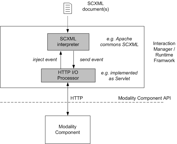 The Runtime Framework provides the environment which hosts the SCXML interpreter. It has to provide an interface to receive events from external components (modality components) and must be able to inject these events into an existing SCXML session or to start SCXML interpreter sessions. The Runtime Framework also needs to provide the possibility to send events to external components (i.e. some implementation of the SCXML <send> tag). In the future this feature might be a covered by the "external communications module" of the SCXML specification ([SCXML]).