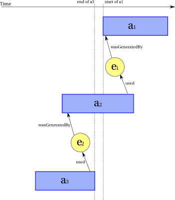 A usage implies ordering of events, since the usage event had to occur during the associated activity. This is illustrated by Figure 3 (b) and expressed by Constraint 33 (usage-within-activity).