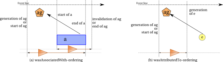 Case 3 of the above constraint says that the agent ag must have ended after the start of the activity a, ensuring some overlap between the two. Since ag is the subject of a wasEndedBy statement, it is an activity according to the typing constraints. Case 4 handles the symmetric case, ensuring that the start of an agent-activity precedes the start of an associated activity.