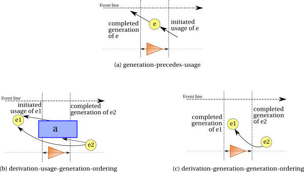 A usage and a generation for a given entity implies ordering of events, since the generation event had to precede the usage event. This is illustrated by Figure 4(a) and expressed by Constraint 37 (generation-precedes-usage).