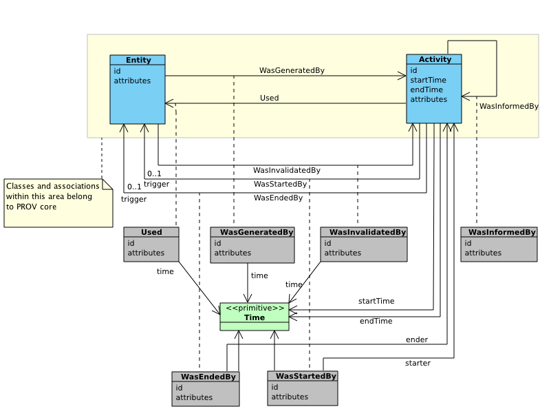 For users to decide whether they can place their trust in something, they may want to analyze its provenance, but also determine the agent its provenance is attributed to, and when it was generated. In other words, users need to be able to determine the provenance of provenance. Hence, provenance is also regarded as an entity (of type Bundle), by which provenance of provenance can then be expressed.