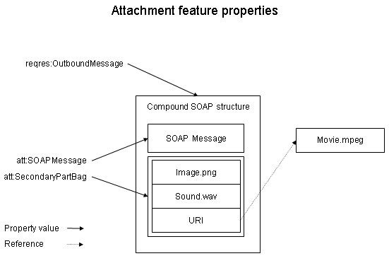 The Attachment Feature defines a set of properties described in Property definition for the Attachment FeatureProperty NameProperty Description SOAPMessage An abstract structure that represents the primary SOAP message part of the compound SOAP structure. SecondaryPartBag An abstract structure that represents the compound SOAP structure's secondary part(s). This structure is a bag that contains representations of each of the compound SOAP structure's secondary part(s). A secondary part representation can be a URI referencing this secondary part, an abstract structure representing the secondary part itself, or both. .