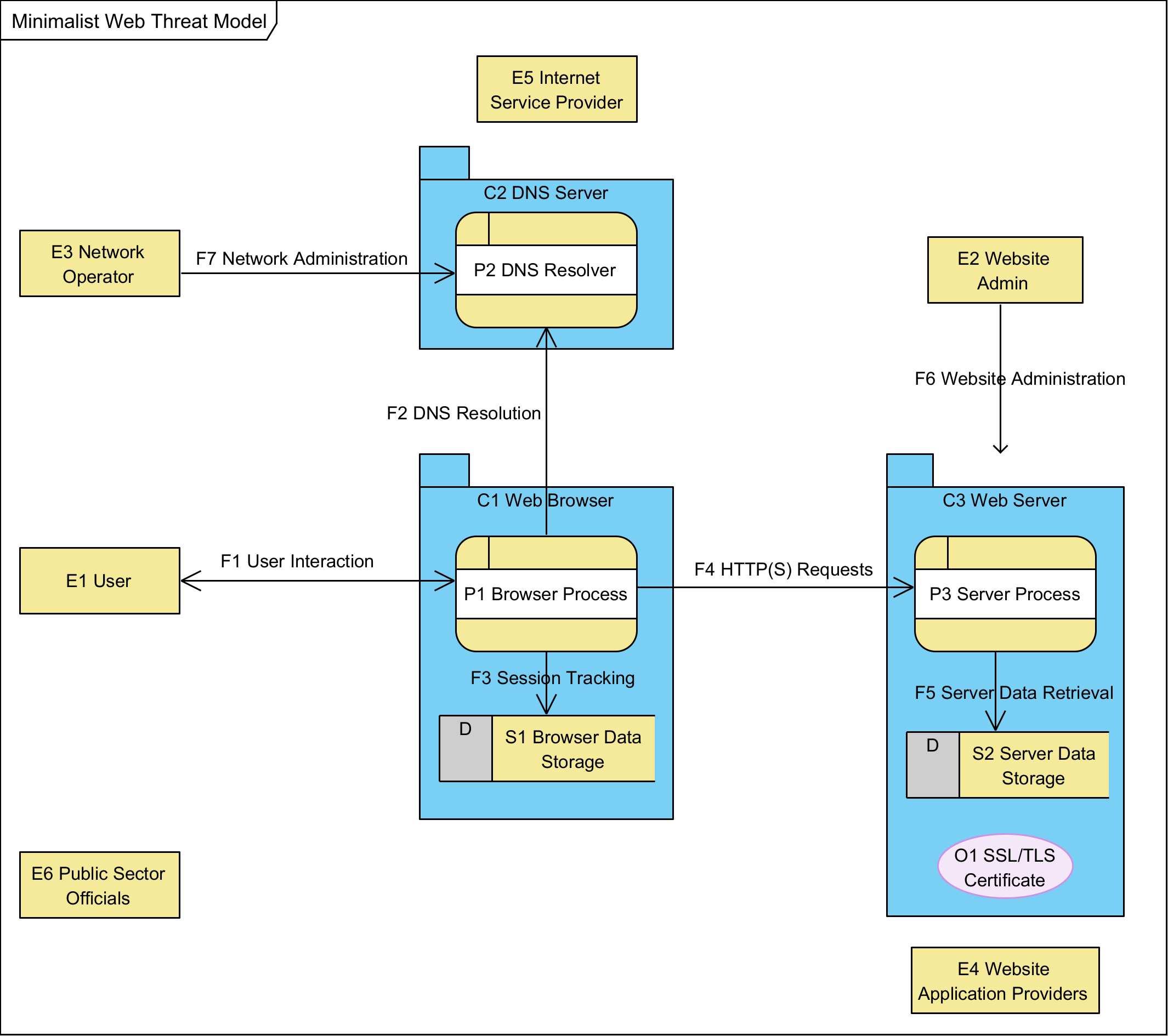 This threat model is an intentionally simplified example, leaving a more thorough analysis to be addressed on a specification by specification basis. |