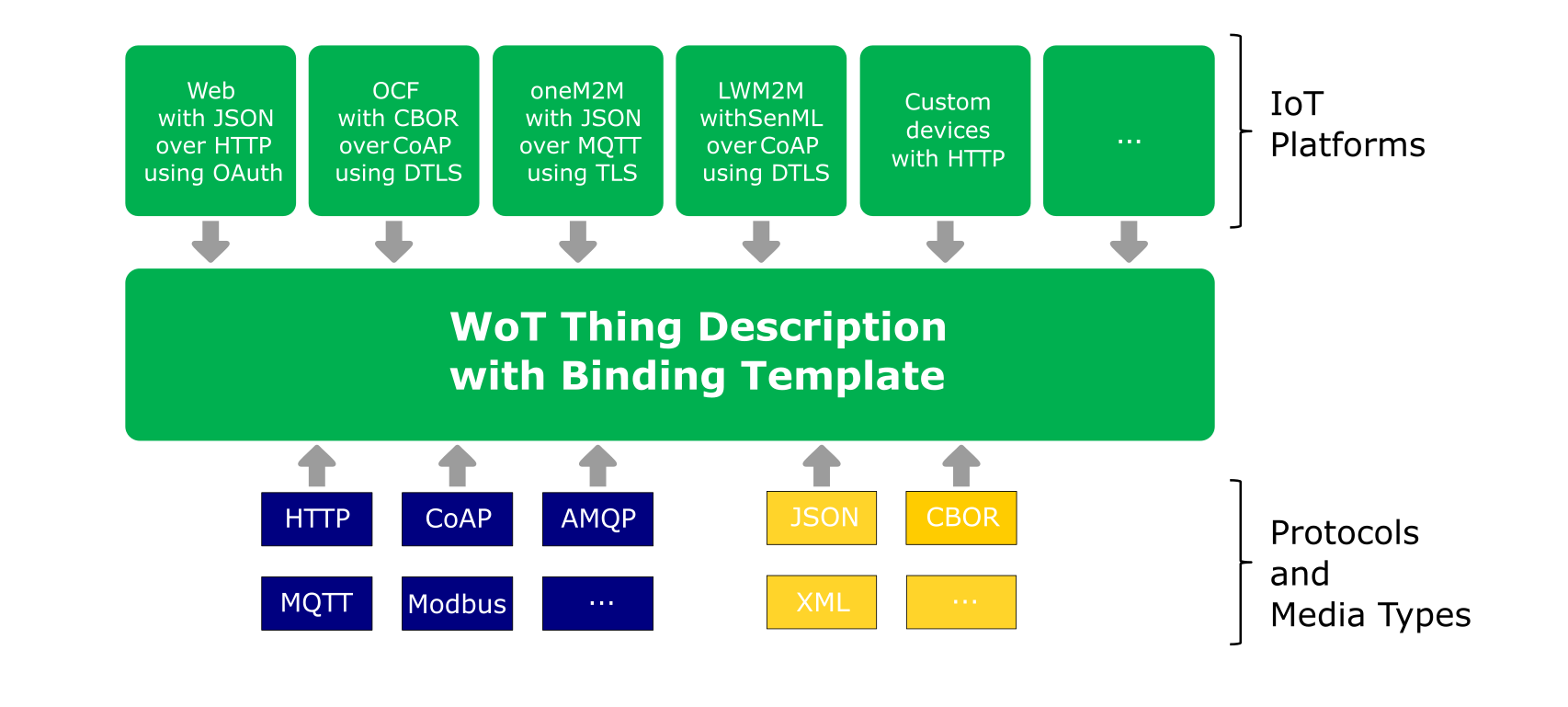 The W3C Web of Things (WoT) enables interoperability across IoT platforms and application domains. The goal of the WoT is to preserve and complement existing IoT standards and solutions. The W3C WoT architecture is designed to describe what exists, and only prescribes new mechanisms when necessary.
