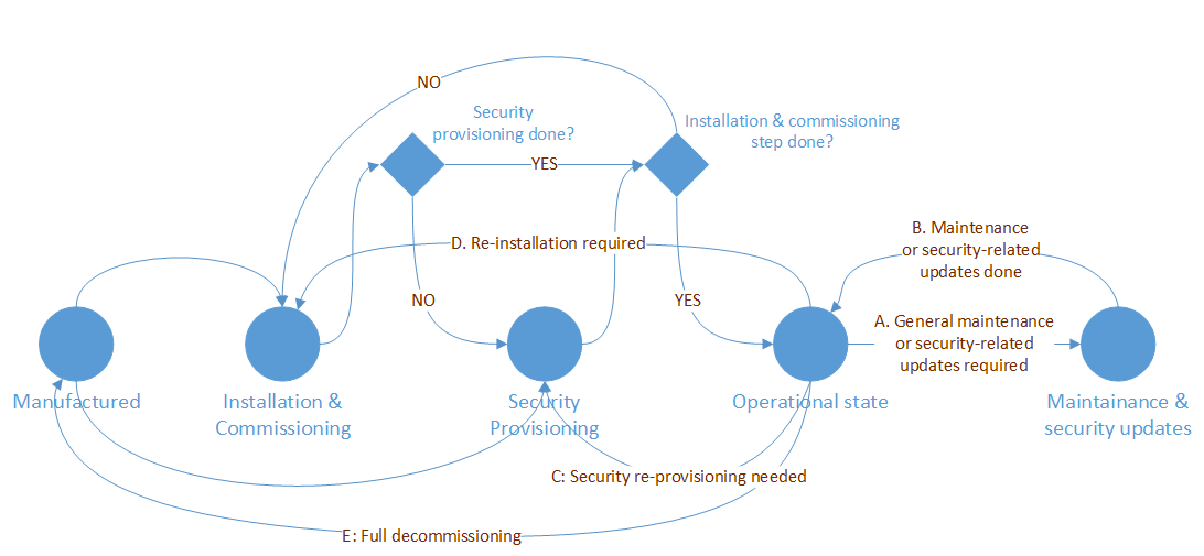 The scope of this document only covers the Operational State of a WoT Device with the assumption that all relevant security metadata and credentials has been successfully provisioned during the Security Provisioning state and are available transparently to the WoT runtime level. Security-related system management updates (such as the revocation and update of keys and other credentials), while important to maintaining the security of a system, are considered to be out of the scope of this document.