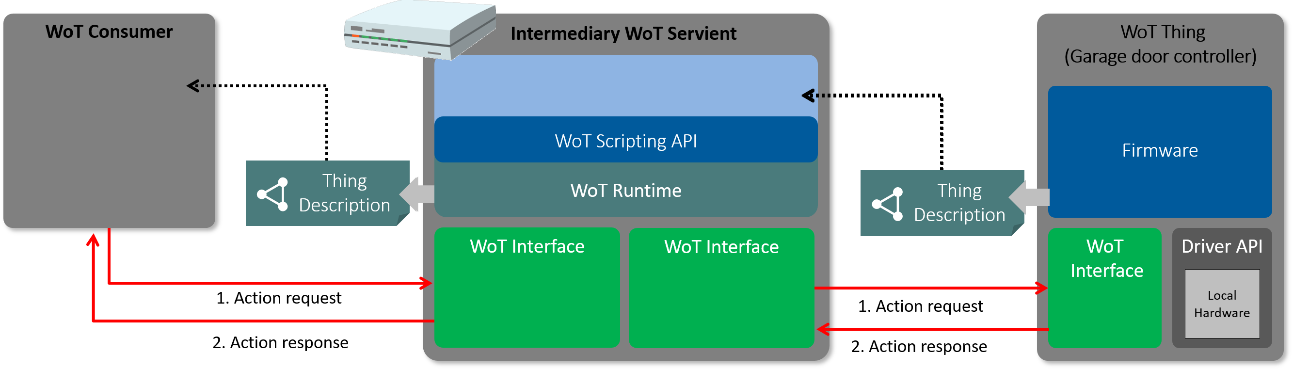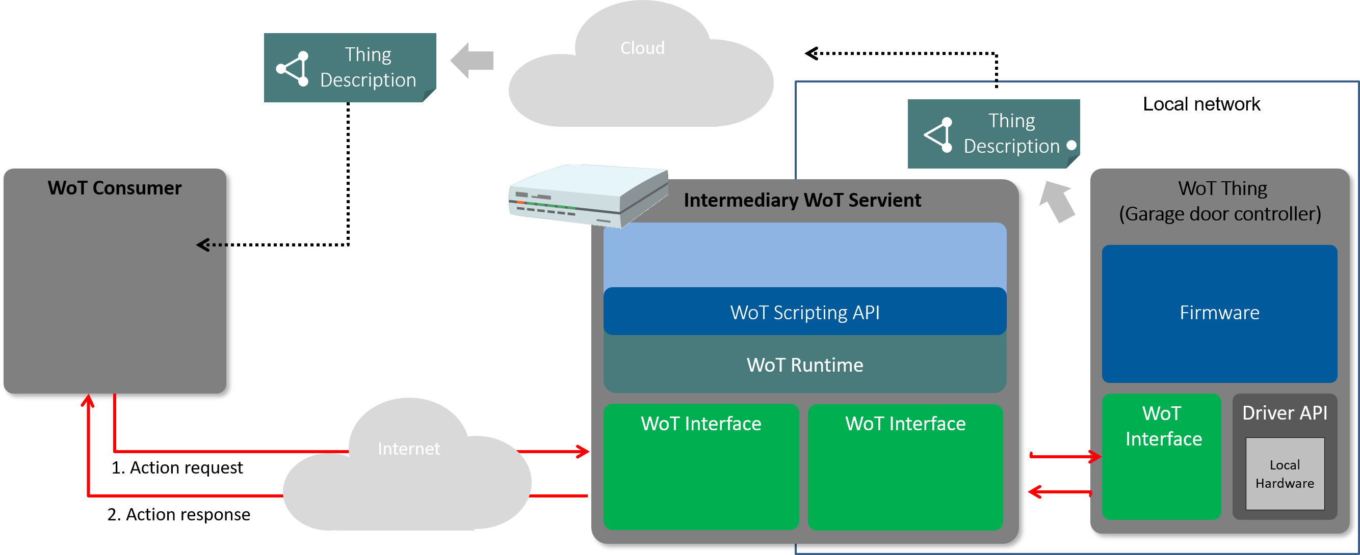 The Thing Description that the Intermediary WoT Servient device provides to the WoT Consumer can be the same as it gets from the device exposing the WoT Thing or it can be modified to better suit the deployment use case or expose additional functionality via the Intermediary WoT Servient. It is also possible that the end device behind the Intermediary WoT Servient is a non-WoT Device and does not provide any Thing Description on its own, and may not support any interaction via a WoT-compatible network Interface. In this case the Intermediary WoT Servient has to build the Thing Description by itself i and expose it to the WoT Consumer. For all typical use cases, the Intermediary WoT Servient should be considered a trusted entity and in this case it can freely modify or build Thing Descriptions it exposes as well as set up fine-grained access controls on different exposed WoT Interfaces. The Intermediary WoT Servient can do this using the same methods described in Section § 7.1 Basic Interaction between WoT Thing and WoT Consumer, i and therefore acts fully on behalf of the end device.