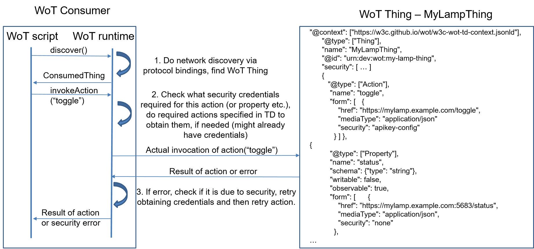 Now if we consider the basic communication scenario between the WoT Consumer and the device exposing the WoT Thing described in Section § 7.1 Basic Interaction between WoT Thing and WoT Consumer from a perspective of script instances running inside WoT Runtime, each such instance should be able to have a way to perform mutual authentication between itself and a remote WoT Consumer or support a token-based authentication method. However, there are no methods in the WoT Scripting API to perform any such tasks. Instead the underlying WoT Runtime and protocol bindings handle the required security functionality transparently for the WoT scripts. Figure 12 shows how it is done, when a WoT Script discovers a new WoT Thing, MyLampThing, using the discover() scripting API method, and invokes an action "toggle".