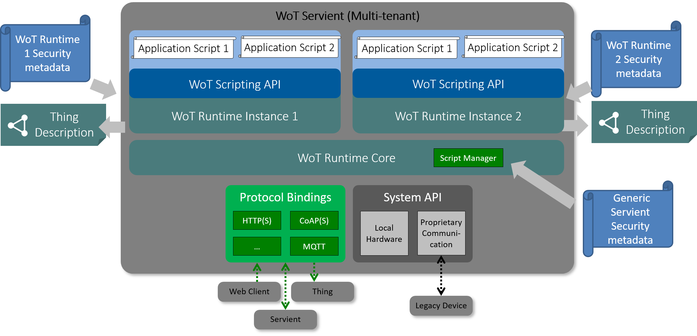 WoT Basic Security Metadata All required security metadata (keys, certificates etc.) that might be provisioned to the WoT Device in order to be able to perform various security-related operations, such as authenticating another device or WoT Consumer in the WoT System, authenticating remote authorization service in case the access control to WoT interfaces is done using tokens, etc. Manager Thing (if present in WoT Runtime) - an entity that can implement script lifecycle management operations, WoT Runtime On device storage, in-transfer including provisioning and updates of security metadata.