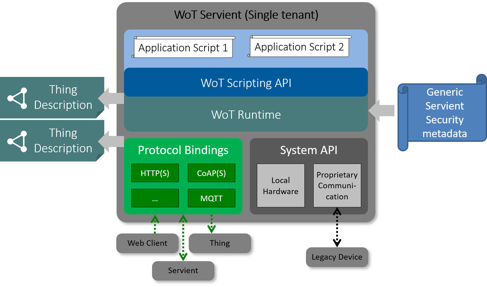 Figure 14 shows the WoT Servient with two different tenants running in two different instances of WoT Runtime. There is a no trust relation between different tenants and they can be untrusted. Each tenant can have multiple independent WoT scripts running inside their WoT Runtime. WoT Runtime core also has a Thing Manager entity that allows installation of scripts into the corresponding WoT Runtimes.