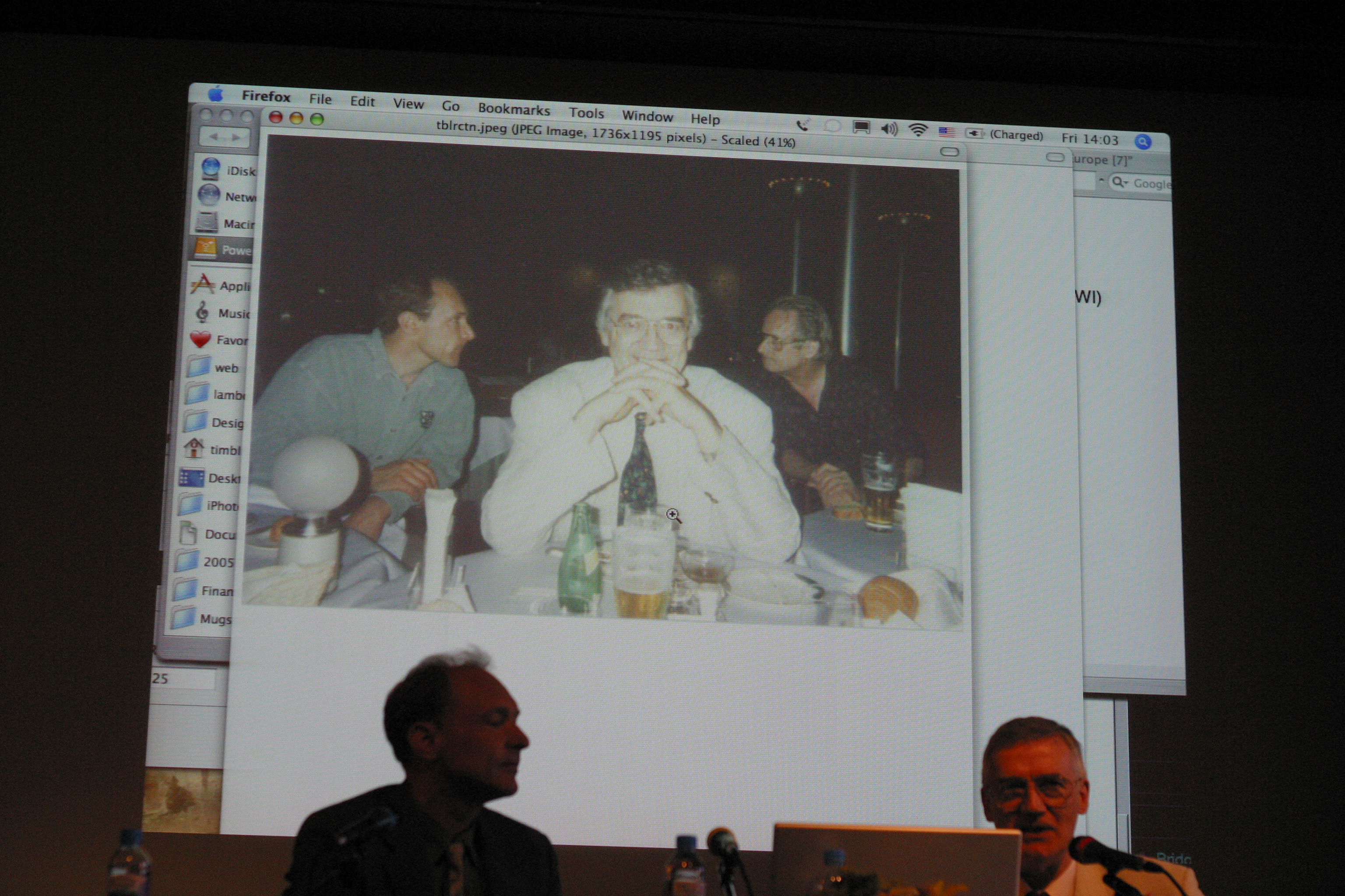 Tim Berners-Lee and Robert Cailliau on the stage during the European celebration of 10 years of W3C. Behind them is a photo of a dinner during a W3C meeting in Tokyo in 1997, with Tim, Robert and Ted Nelson. (Photo: Bert Bos.)