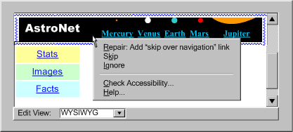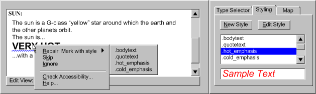 Example B.3.2-2.2: This illustration shows an authoring interface that checks for and displays spelling and accessibility errors with the same prominence. In this case, the author has activated a right-click pop-up menu that includes spelling and accessibility repair options. (Source: mockup by AUWG)